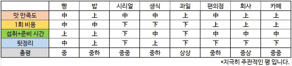 나는 아침을 먹는 것을 좋아한다. 물론 이는 아침은 꼭 먹고 하루를 시작해야 한다는 어머니의 생각에서부터 왔다. 어릴 적부터 아침을 꼬박꼬박 먹다 보니 아침에 무언가를 먹으면 왠지 기분 좋게 시작하는 느낌이 들어 나와서도 챙겨 먹기 시작했다. 작년부터 자취를 시작하고 가장 많은 고민을 했던 것은 아침이었다. 점심, 저녁이야 회사에서 먹으면 되는데 아침은 출근해서 아침을 먹자니 시간적/금전적 비용이 너무 많이 든다는 것이었다. 그래서 다양한 아침 식사를 시도했다.